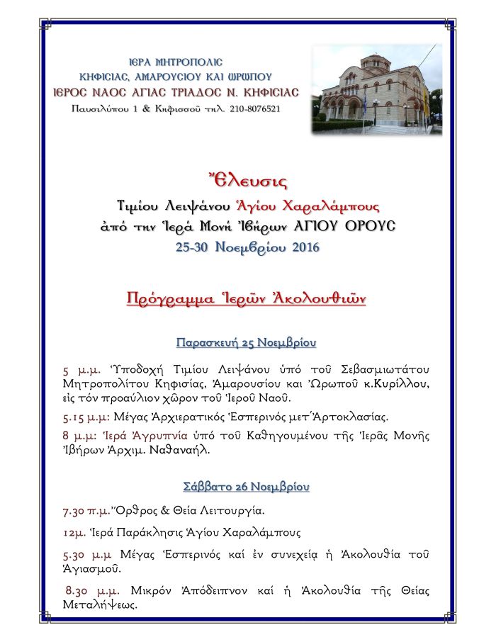 Την Παρασκευή 25 Νοεμβρίου 2016, ανήμερα της εορτής της Αγίας Αικατερίνης, το Τίμιο Λείψανο του Αγίου Χαραλάμπους από τη Μονή Ιβήρων του Αγίου Όρους θα βρεθεί στην Μητρόπολη Κηφισίας.
