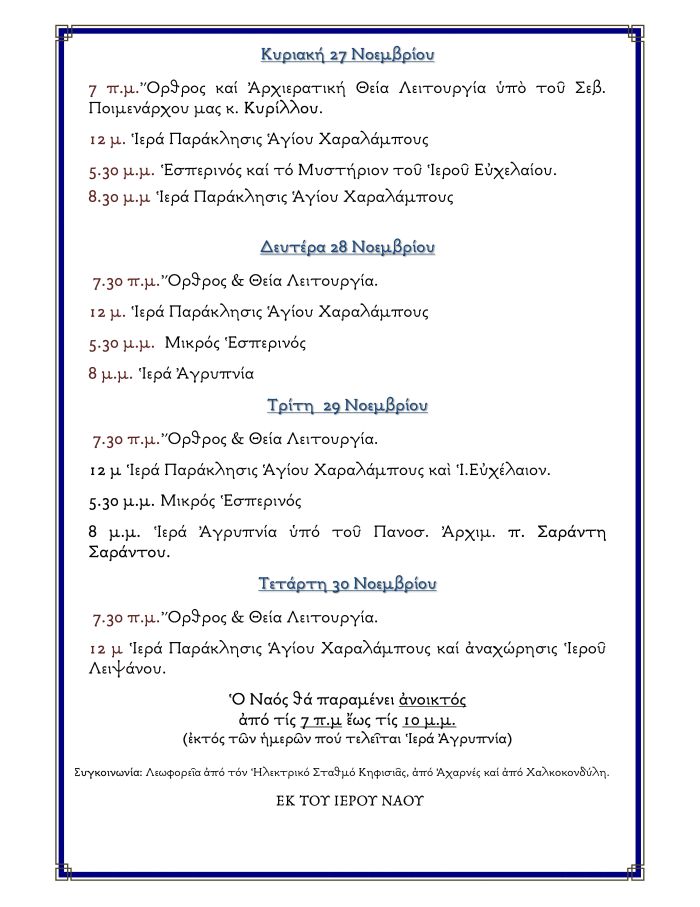 Το πρόγραμμα που θα ακολουθηθεί κατά την παραμονή του Λειψάνου του Αγίου Χαραλάμπους στον Ιερό Ναό Αγίας Τριάδος, είναι το ακόλουθο: